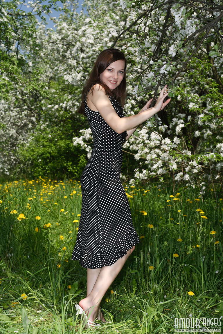 Captivating attractive angel has gone to the garden to wander there fully nude and to entertain with her striking humps.