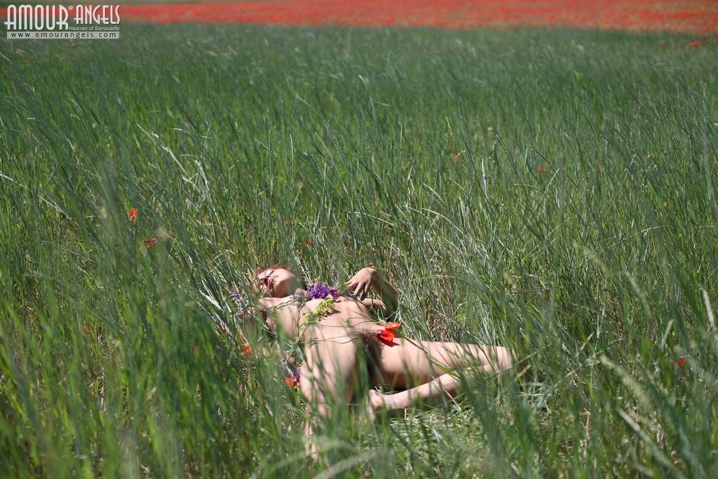 Sunny weather and green field with lots of different flowers is the most pleasant and suitable place for this cheeky nude teen to entertain.