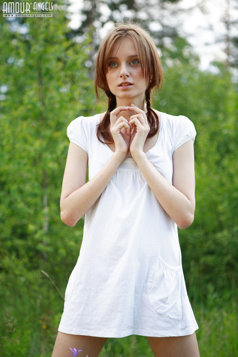 Timid teen girl comes to the nature and poses her beautiful body in front of the camera.