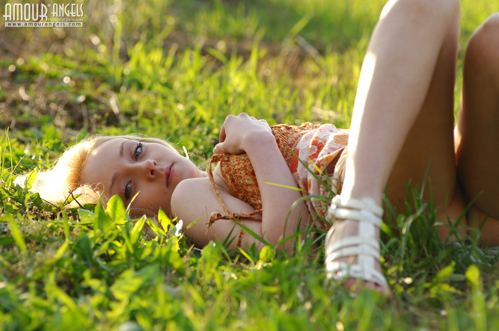 This time blonde girl poses in dress on the grass and shows carefully shaved pussy in heat.