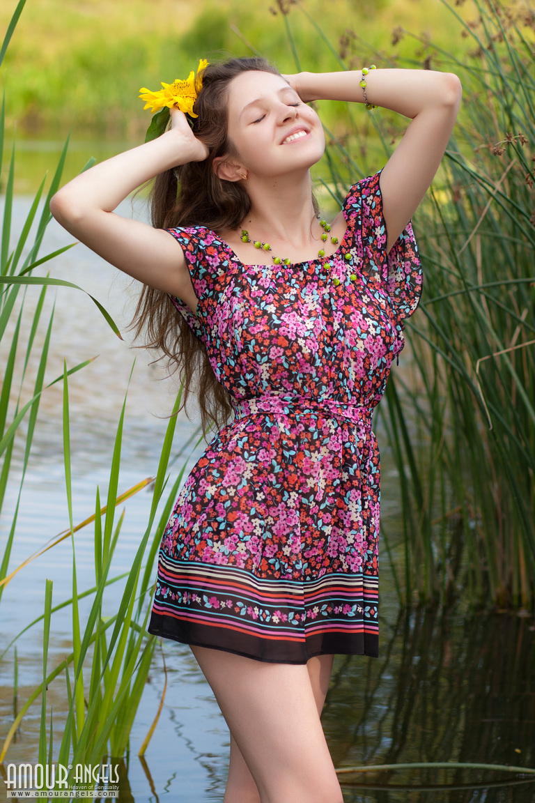 Entrancing teen takes off her dress by the river and exposes her perfectly shaped nude body.