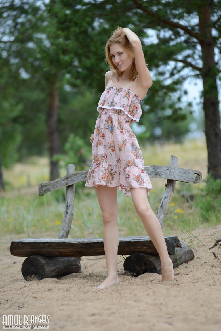Beautiful slim teen cutie with perky small tits stripping and spreading legs on a park bench.