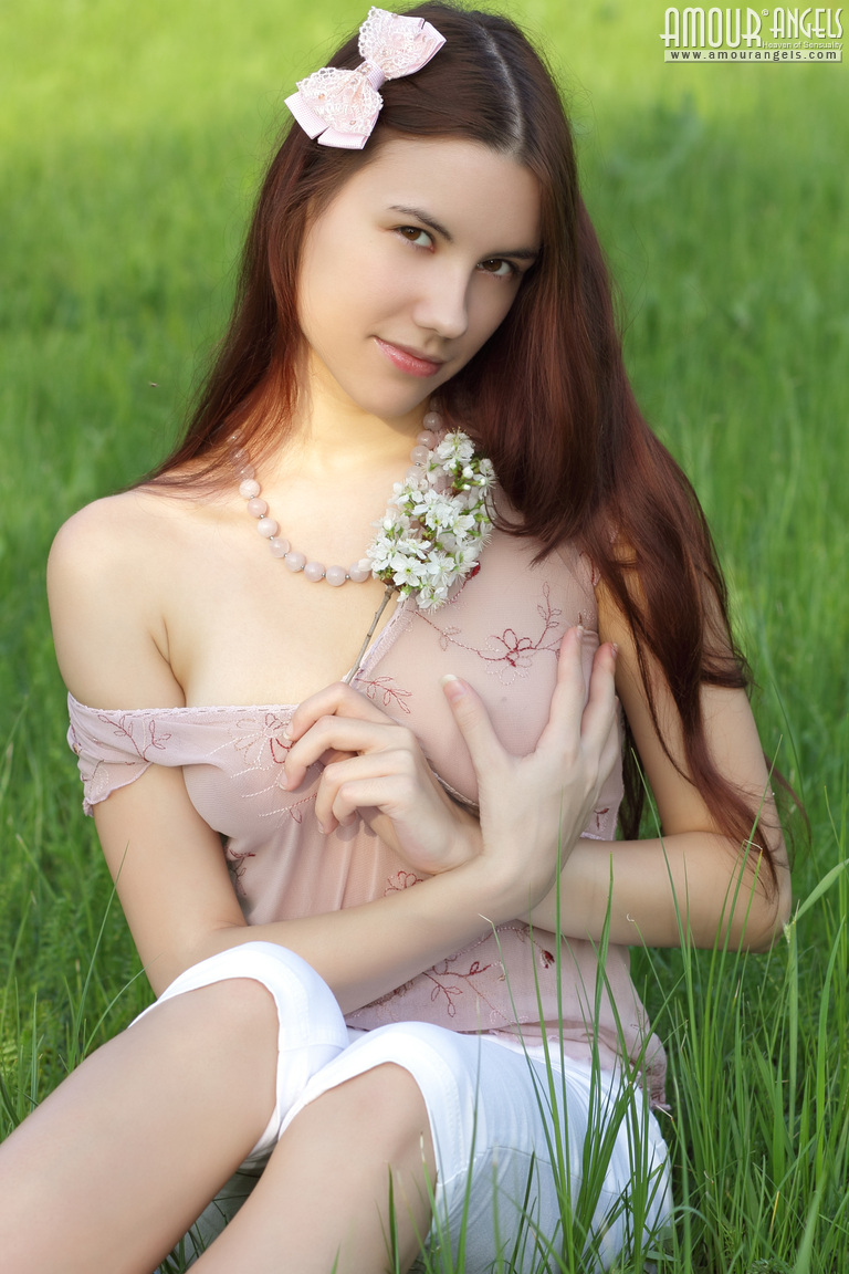 Charming teen peach with a bow in her hair undressing and showing luxurious body in a field.