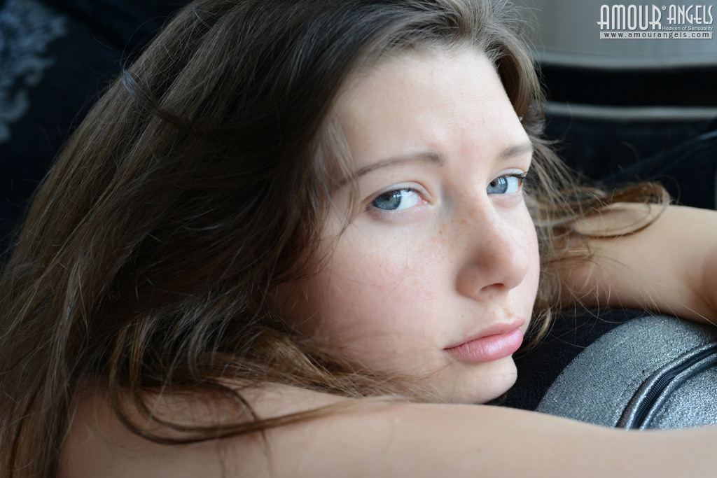 Gorgeous long haired busty shapely teen cutie posing in only a sexy stocking on the sofa.
