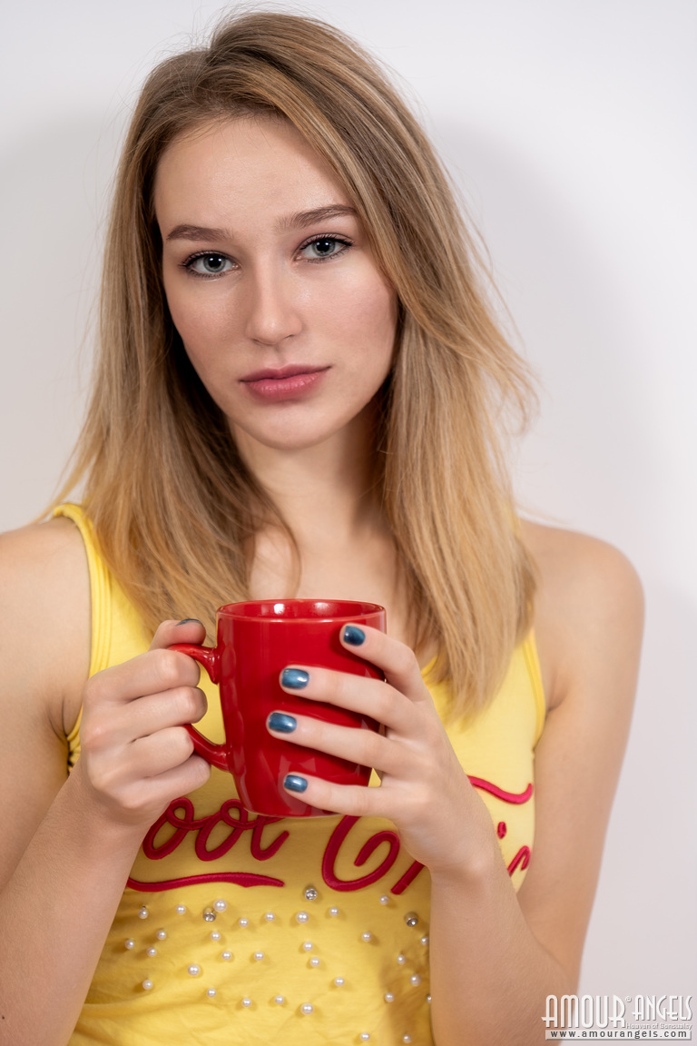 Busty and extremely sexy blonde angel with perfect big natural tits flashes her sweet shaved pussy for the camera.