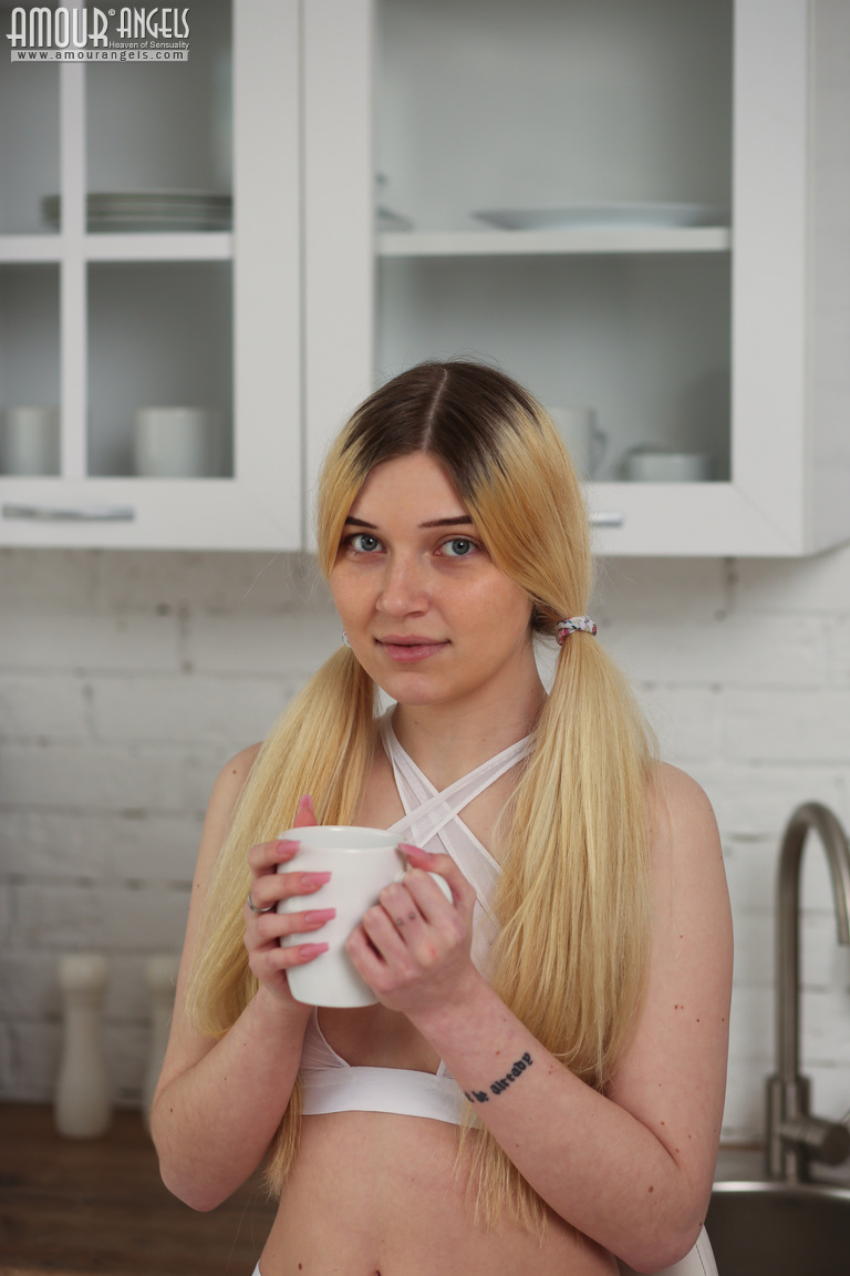 Sweet teen cutie exposes her sexy naked body with tight tits and tasty pussy in the kitchen
