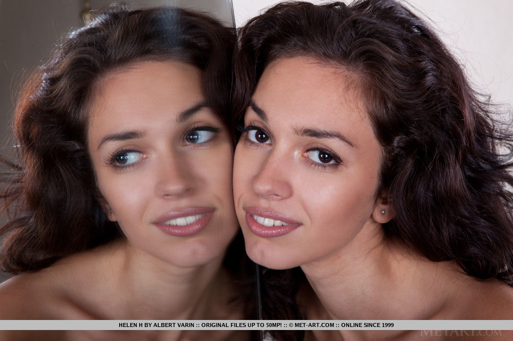 A naughty helen h playfully posing near a mirror, providing an exciting double vision of her naked body.