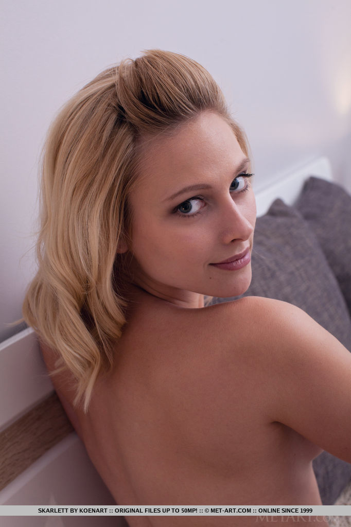 Skarlett effortlessly raises the room temperature with her erotic poses on top of the bed in her matching lingerie.