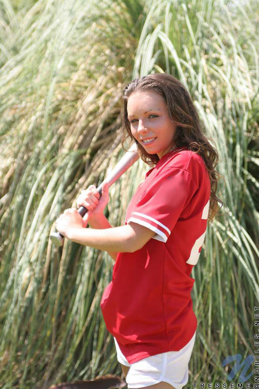 Hottie hangs out outside doing a little batting practice before getting out of her sweaty clothes