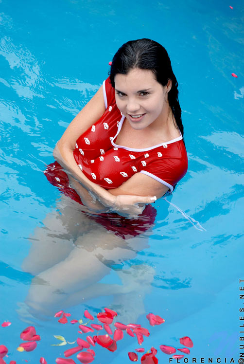 Alluring teen enjoys swimming and teasing with a red roses petals on pool