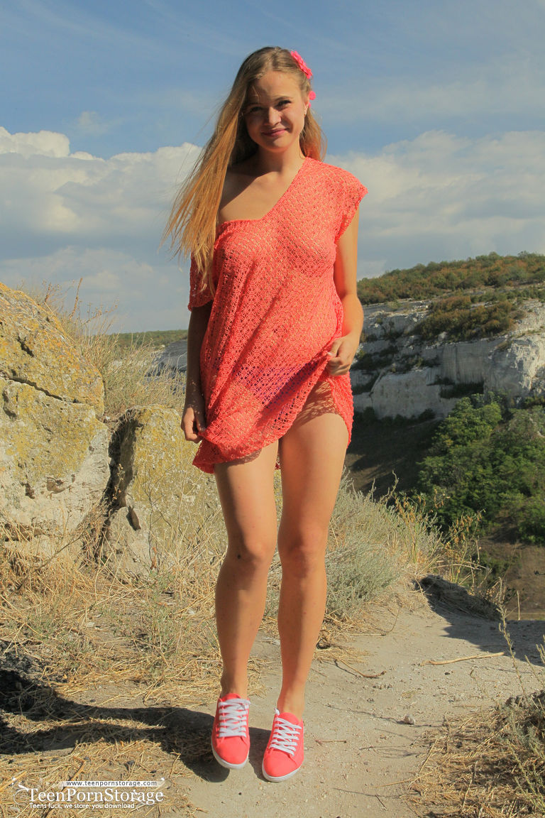 Gorgeous teen embraces the summer with stripping off her clothes in front of beautiful scenery where she can feel free.
