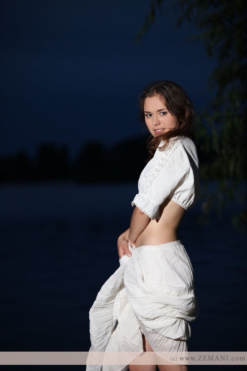 Cute young girl takes her white clothes off and poses nude on the night lake.