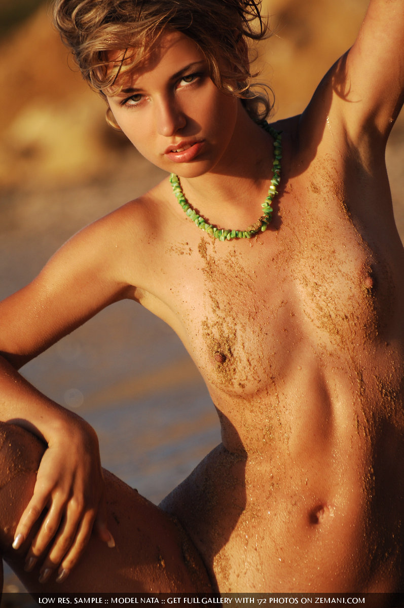 Pretty playful blonde nata takes off her swimsuit and poses naked at the sea surf in sunset light